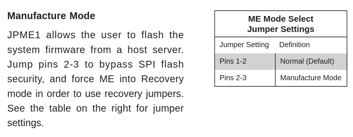 I grabbed the BIOS update file from the SuperMicro website, created a FreeDOS USB stick with Rufus, and copied the DOS flash tool along with the BIOS image to the FreeDOS drive. plugged that into the internal USB3 socket on the node motherboard, booted it up, and tried to flash. the flash tool said it needed to reboot the system into an Intel ME maintenance mode to continue, so I let it reboot… and then it came back up saying that the hardware doesn’t support switching into ME maintenance mode from software. makes sense I guess.